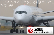 今日、新しく「blogランキング用のバナー」などを自作しました(・∀・) クリックしていただくとランキングが上がっていくわけですが、ランキングが上がればわたしのヤル気度もアップしてblogの更新度も upするかと思いますんで、どーぞ皆様クリックしてくださいな(・∀・)ノ そもそも、このblogの更新度が下がったのは、以前登録していたblogランキングサイトが閉鎖されてしまったからなんです。 当時は「国内旅行ランキング」で常に1位あたりをキープしてましたんで、閉鎖に伴いモチベーションが下がったことは否めません(笑) いまはたんまりとネタがありますから、これからどんどん記事をupしていきたいと思います♪ と。 そんな話はどーでもよくw、今日は搭乗記です(・∀・) この前、某K氏のblogに「JALの787に乗った云々」とコメントしましたら、『そんな話題は是非blogに載せてくれないと(゚Д゚)』 と言われまして、それじゃあということで今回はその話題を書きます。 ※JALのB787はこんなひこーきです(・∀・) ![]() Boeing787はANAとかだと国内線でいっぱい飛んでますが、JALは国際線ばかりで搭乗する機会がなかなかありません。 昨年逝ったハワイ便で乗れる可能性があったんですが、残念ながら乗ったのは就航直前で767-300でした( ;∀;) で。 毎日のようにJALのHPを眺めているうちに、すばらしい便を見つけたんですよヽ(゚∀゚)ノ 続きを見る(゚Д゚) #